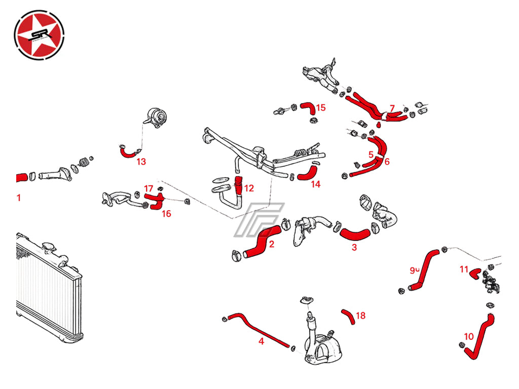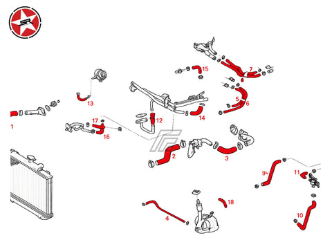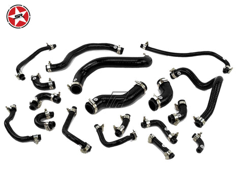 This high quality reinforced silicone hose kit replaces 18 coolant hoses in the engine bay listed below.